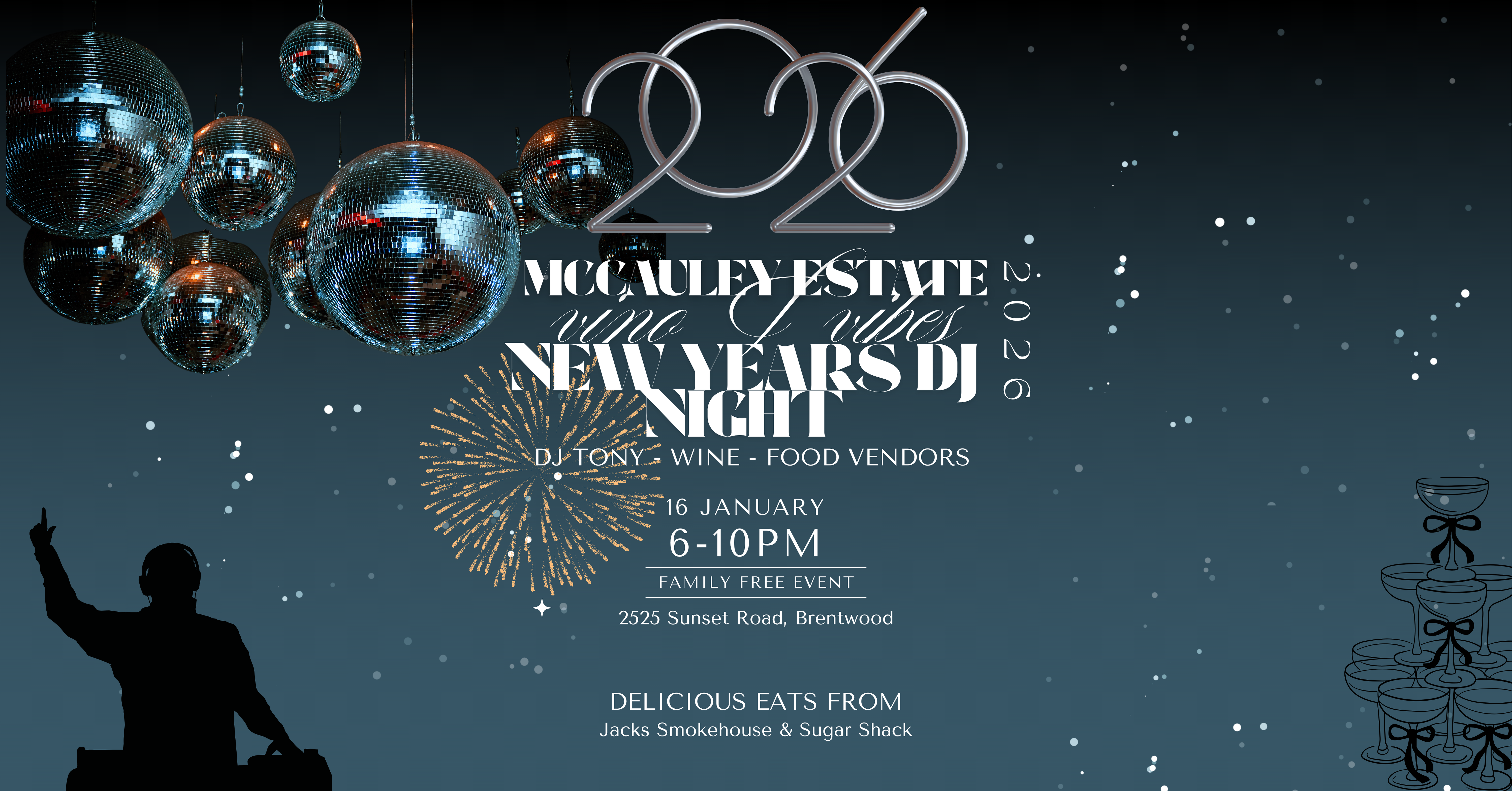 Start your new year off right with an evening of wine, music, and good company at McCauley Estate Vineyards! Join us for our Vino & Vibes New Year’s DJ Night, where we’re bringing together the best local food, fantastic wines, and energetic beats for a night you won’t forget.