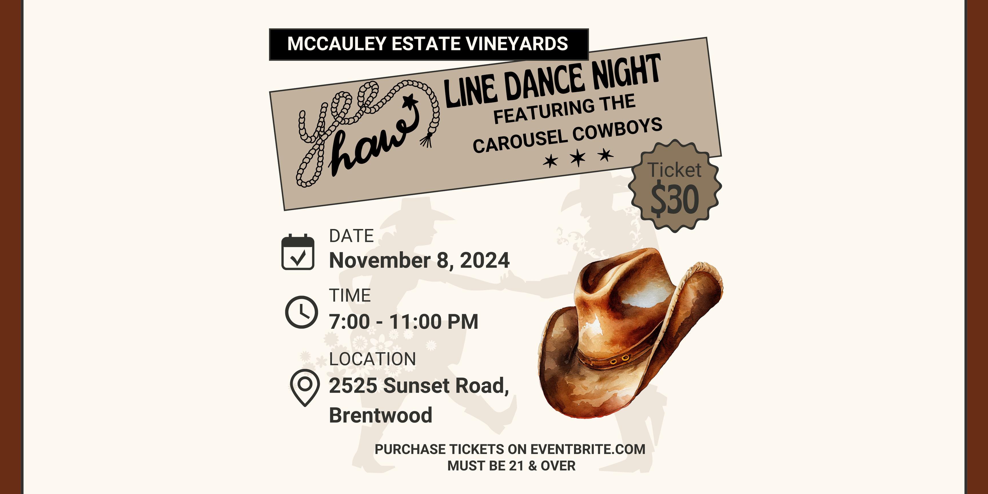 Get ready to kick up your heels and have a blast at our Line Dance Night with the Carousel Cowboys! Join us on November 8th from 7-11PM.